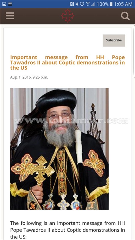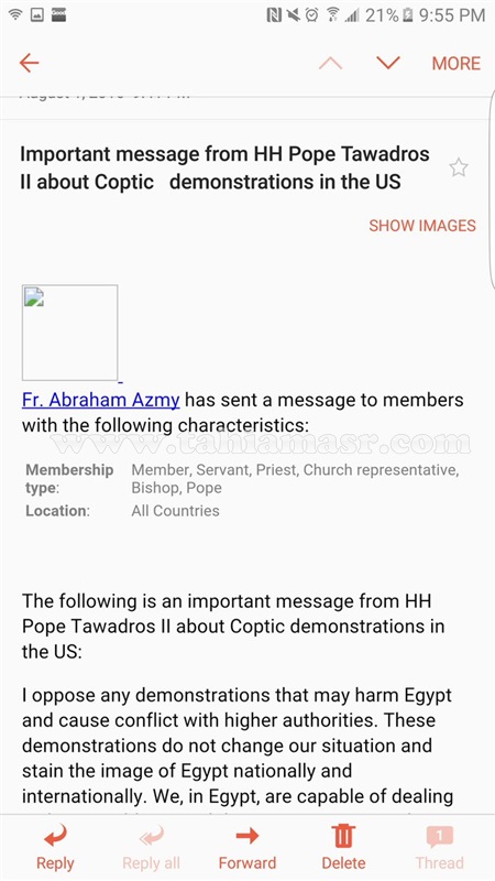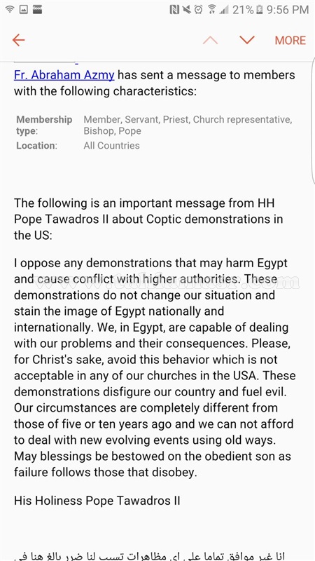 نشرت سيدة مصرية قبطية تعيش في أمريكا رسالة إلكترونية، قالت انها من البابا تواضروس الثاني للمصريين في الخارج، يطالبهم فيها بعدم التظاهر والحفاظ علي صورة مصر في الداخل والخارج، وجاء نص الرسالة الألكترونية كالتالي:_