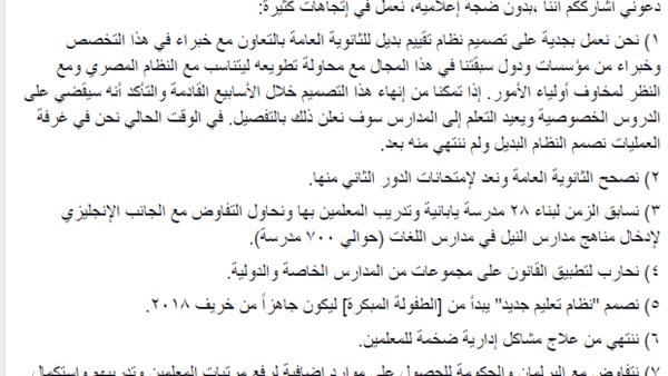 وتابع:"إذا تمكنا من إنهاء هذا التصميم خلال الأسابيع القادمة والتأكد أنه سيقضى على الدروس الخصوصية ويعيد التعلم إلى المدارس سوف نعلن ذلك بالتفصيل. فى الوقت الحالى نحن فى غرفة العمليات نصمم النظام البديل ولم ننتهى منه بعد".