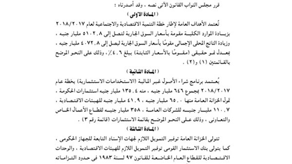 ونص القرار على اعتماد برنامج شراء الأصول غير المالية، بخطة عام 2017-2018 بمجموع 646 مليار جنيه منه 135 مليار جنيه استثمارات الحكومة، تمول الخزانة العامة منها.