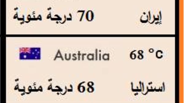 وأضاف الدكتور اشرف تادرس في تصريحات لـ " تحيا مصر" أن تأتي دولة أستراليا ثاني أسخن بقاع الأرض حيث تبلغ درجة حرارتها 68 درجة مئوية، وتحتل الصين المركز الثالث بدرجة حرارة 66 درجة مئوية.