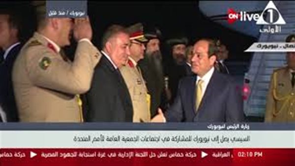 عرض التليفزيون المصرى لقطات وصول الرئيس عبدالفتاح السيسى إلى مدينة نيويورك الامريكية، للمشاركة فى أعمال الدورة 72 للجمعية العامة للأمم المتحدة.