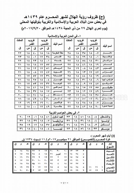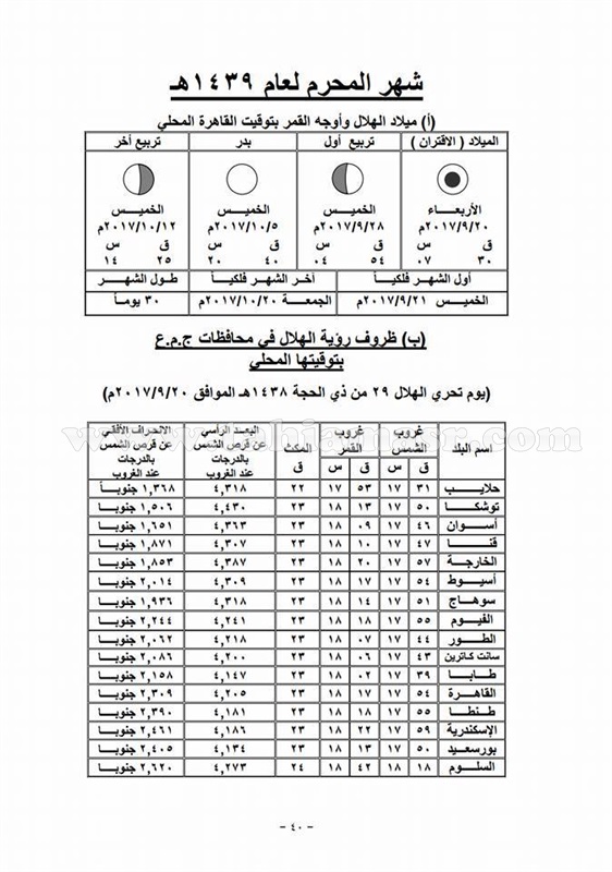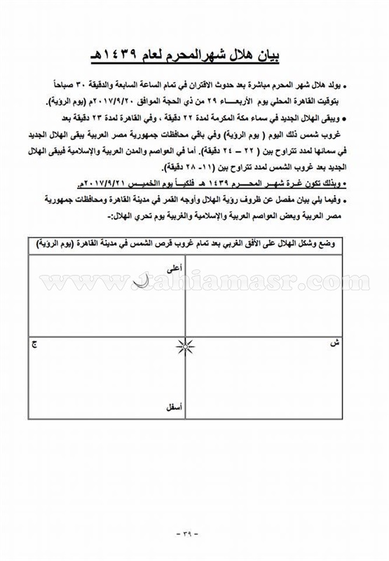 قٌال الدكتور ياسر عبدالهادي استاذ بقسم الشمس بالمعهد القومي للبحوث الفلكية إنه بالرغم من بيان دار الإفتاء حول بداية شهر محرم 1439هـ بأن اليوم الخميس 21 سبتمبر هو المتمم لشهر ذي الحجة من عام 1438هـ إلا أننا - كأهل الذكر - في هذا المجال وكمتخصصين في علم الفلك الشرعي نقرر ونؤكد على أن هذا التقرير مخالف لما يقطع به العلم والشرع.