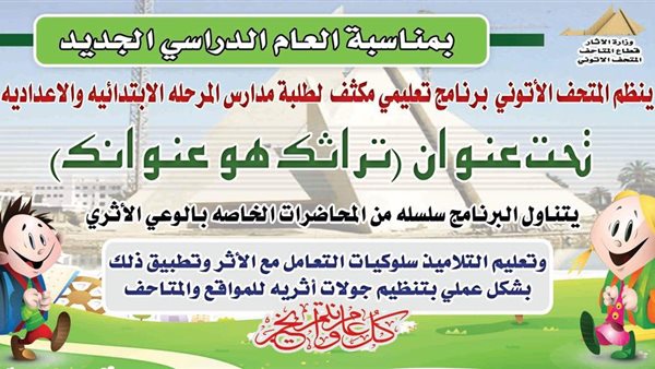 وفي سياق متصل أضافت صلاح أن المتحف الأتوني سيقيم برنامج تعليمي لتلاميذ المدارس الابتدائيه والإعداديه تحت عنوان ( تراثك هو عنوانك) ويتضمن سلسله من المحاضرات الخاصه بالوعي الأثري وكيفية التعامل مع الأثر وتطبيقها عمليا بتنظيم جولات أثريه للطلاب المشاركين بالبرنامج.