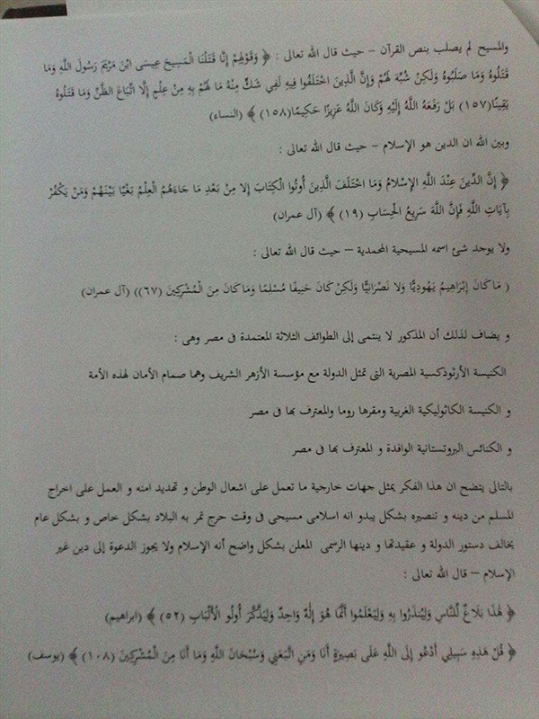 بالتالى يتضح ان هذا الفكر يمثل جهات خارجية ما تعمل على اشعال الوطن و تهديد امنه و العمل على اخراج المسلم من دينه و تنصيره بشكل يبدو انه اسلامى مسيحى فى وقت حرج تمر به البلاد بشكل خاص و بشكل عام يخالف دستور الدولة و عقيدتها و دينها الرسمى المعلن بشكل واضح أنه الإسلام ولا يجوز الدعوة إلى دين غير الإسلام – قال الله تعالى :