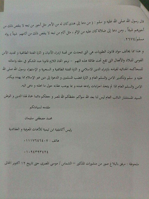 و هذا مما يخالف مواد قانون العقوبات هى التى تتحدث عن تهمة ازدراء الأديان و اثارة الفتنة الطائفية و تهديد الأمن القومى للبلاد والأفعال التى تقع تحت طائلة هذه التهم - نرجو اتخاذ اللازم قانونا ضد المشكو في حقه واحالته للمحاكمه الجنائيه لقيامه بازدراء الدين الاسلامي و اثارة الفتنة الطائفية و السخرية و الإستهزاء برسول الله صلى الله عليه و سلم وتكدير الامن والسلم العام و اثارة غضب المسلمين و الدعوة إلى دين غير الإسلام مما يهدد ويكدر الامن والسلم العام اذا لم يتخذ اجراءات رادعه ضده و بما يوجب عقابه حول ما اعلنه و دعى اليه