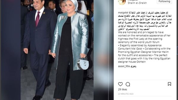 مصممة الأزياء مرمر حليم، قالت خلال حسابها الخاص على انستجرام وفيس بوك ثالت: "لقد حظينا بعظيم الشرف إذ عملنا على الإطلالة الخلابة التي ظهرت بها السيدة الأولى خلال حفل الافتتاح لمنتدى شباب العالم، حيث تم هذا المزج الأنيق بمعرفة خبيرة الأزياء مي جلال، بينما جاء الكلاتش الرائع من تصميم بيت الأزياء المصري "الأختيْن".