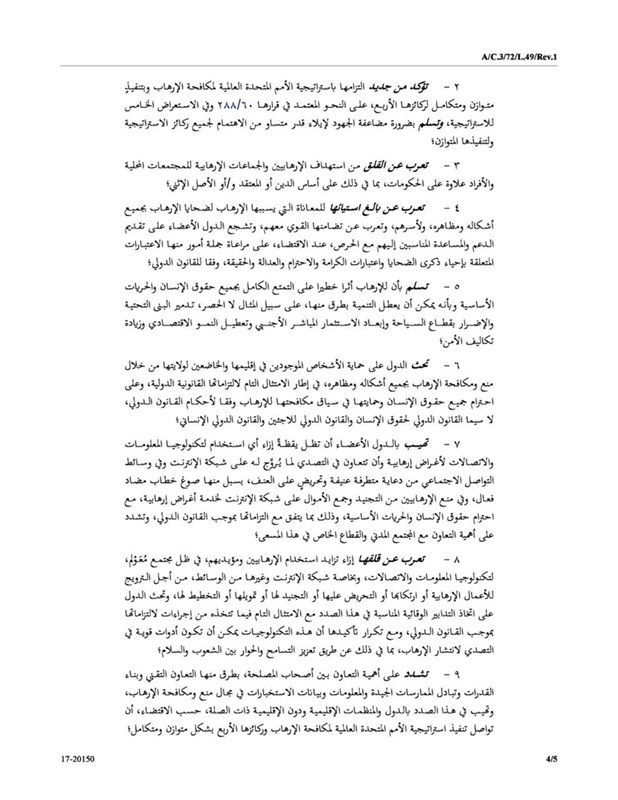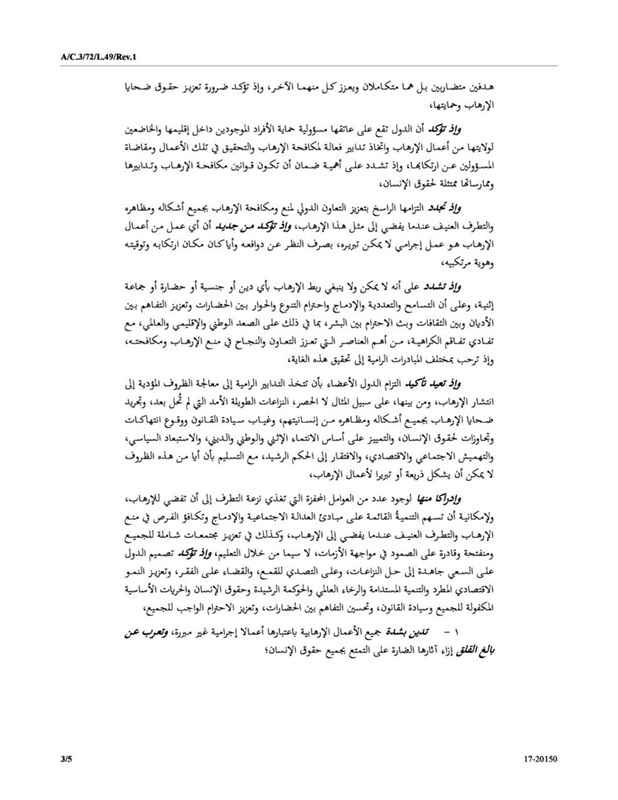 والقرار يتناول آثار الإرهاب على حقوق الإنسان ويؤكد على حق الدولة في منع كافة أشكال الإرهاب وحماية مواطنيها منه.