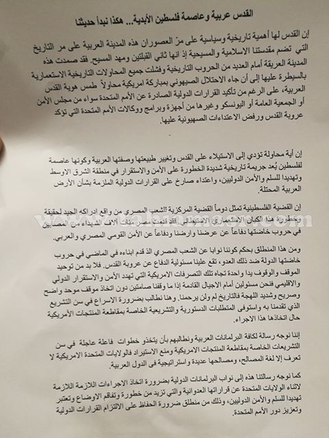 وقال الشرقاوى، اننا نوجه رسالة لكافة البرلمانات العربية، ونطالبهم بان يتخذوا خطوات فاعلة وعاجلة لوقف قرار ترامب.