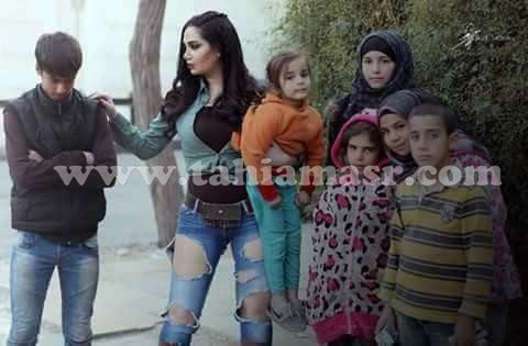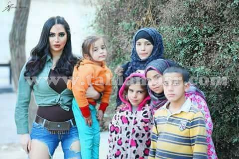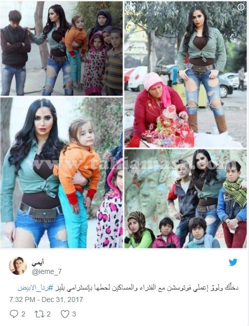 وظهرت رنا في الصور، وهي مرتدية بنطال جينز مشقق وسترة خضراء، وقد حرصت على إطلالة جاذبة، في حين وقفت في الصور بطريقة استعراضية، وسط مجموعة أطفال، وخلف سيدة مسنة، بدا عليهم جميعًا البؤس والحاجة.