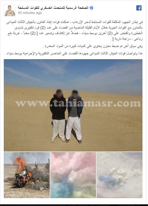 أصدر المتحدث العسكري، عقيد أركان حرب تامر الرفاعي، بيانًا، الخميس، جاء فيه أنه «في إطار الجهود المكثفة للقوات المسلحة لدحر الإرهاب، تمكنت قوات إنفاذ القانون بالجيش الثالث الميدانى بالتعاون مع القوات الجوية خلال الأيام القليلة الماضية من القضاء على عدد (2) فرد تكفيرى شديدى الخطورة والقبض على (2) آخرين بوسط سيناء، فضلاً عن اكتشاف وتدمير عدد (2) مخبأ، عربة دفع رباعى، دراجة نارية».