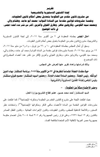 ننشر تقرير لجنة الشئون التشريعية بمجلس النواب، حول مشروع قانون الحكومة بتعديل قانون العقوبات؛ و5 مشروعات قوانين أخرى مقدمة من النواب محمد أبو حامد، هشام والي، محمد الكومي، كارولين ماهر، طارق الخولى فى ذات الصدد.