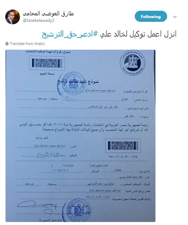 نشر المحامي الحقوقي طارق العوضي، صورة لأول توكيل للحقوقي خالد علي، من أحد المواطنين في محافظة بورسعيد، حيث قام صاحب التوكيل بتأييد خالد علي للترشح في الانتخابات الرئاسية، كرئيس لمصر عام 2018.