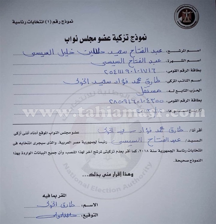 وقع النائب طارق الخولى أمين سر لجنة العلاقات الخارجية بمجلس النواب وعضو لجنة العفو الرئاسى اليوم الثلاثاء على نموذج الهيئة الوطنية للانتخابات لتزكية الرئيس عبد الفتاح السيسى للترشح لفترة رئاسية ثانية بالانتخابات المقبلة.