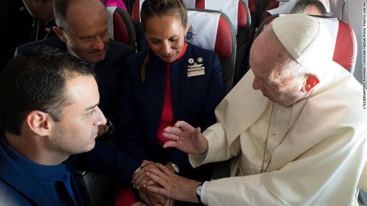 ونقلت الوكالة عن العروس قولها: "إن البابا فرانسيس أخبرها أنها المرة الأولى له الذي يقيم فيها مراسم زواج على متن طائرة".