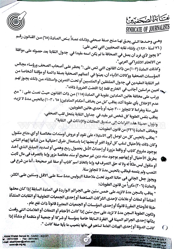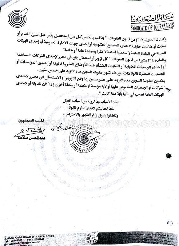 تقدم عبد المحسن سلامه نقيب الصحفيين ورئيس مجلس إدارة مؤسسة الأهرام، ببلاغ للمستشار نبيل صادق بشأن قيام أحد المقاولين بإنشاء نقابة للصحفيين والقنوات الفضائية، بالمخالفة لأحكام الدستور والقانون الأمر، الذي يعد نصب واحتيال وتحصيل مبالغ مالية بدون وجهه حق.