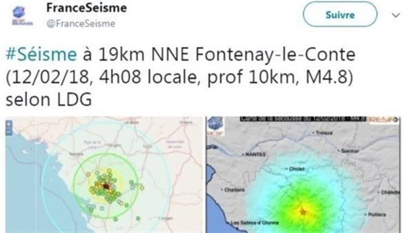 ضرب زلزال بقوة 4.8 درجات فجر اليوم الإثنين، إقليم فونديه غربي فرنسا، دون أنباء عن وقوع أضرار مادية أو سقوط ضحايا.