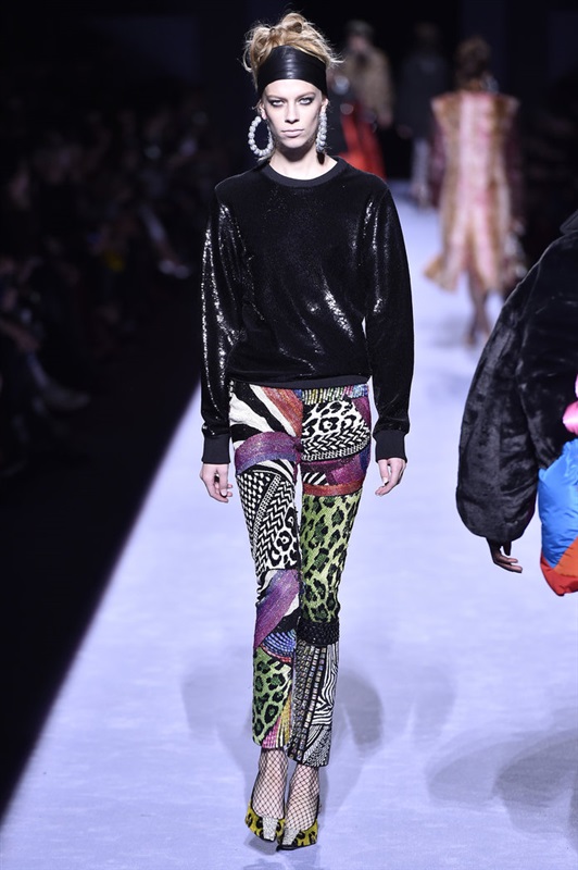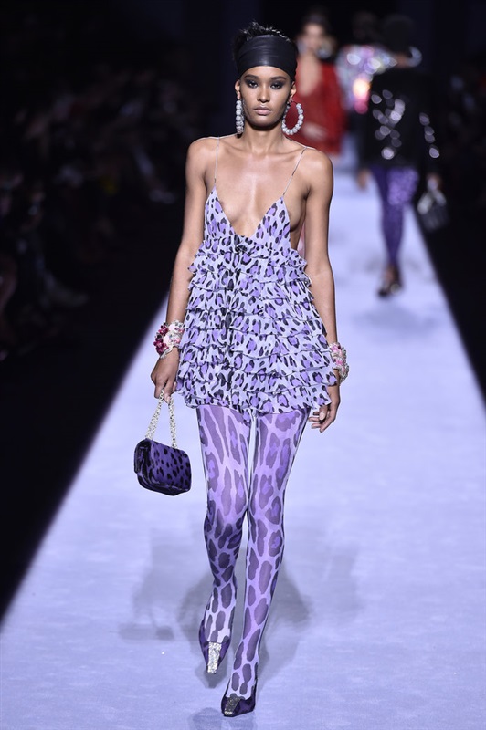 أما مصمم الأزياء الأمريكي “توم فورد”، فكانت تصميماته تغلبها الإثارة والتنوع في الألوان بدءًا من الأبيض والأسود إلى درجات الأرجواني، والأخضر، والأحمر، فتخيلي هنا فستانًا بنقشة جلد الفهد مع جوارب من نفس النقشة.
