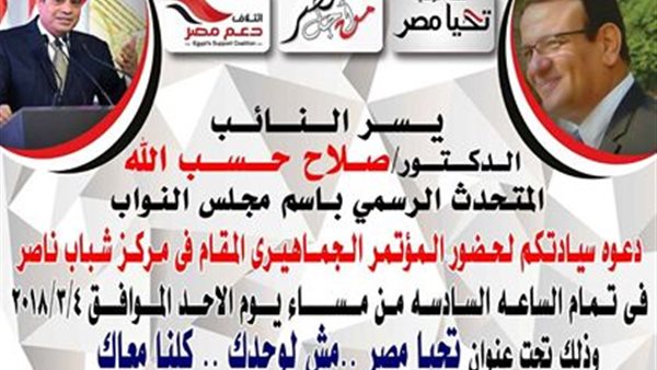 يعقد الدكتور صلاح حسب الله رئيس حزب الحرية المتحدث الرسمي لمجلس النواب، مؤتمر جماهيرى لدعم الرئيس عبدالفتاح السيسي فى الانتخابات الرئاسية، غدا الاحد.