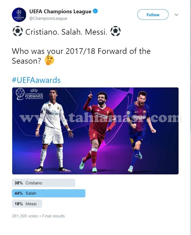 تفوق النجم المصري محمد صلاح المحترف فى نادى ليفربول الإنجليزى على كريستيانو رونالدو نجم ريال مدريد الإسبانى السابق ويوفنتوس الإيطالى الحالى، وليونيل ميسي نجم برشلونة الإسبانى، فى الاستفتاء الذى طرحته الصفحة الرسمية لبطولة دورى أبطال أوروبا بموقع "تويتر"، لاختيار المهاجم الأفضل في النسخة الماضية من المسابقة.