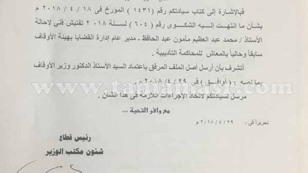 جاء ذلك في مذكرة أرسلها اللواء عمرو فاروق شكري، رئيس قطاع شئون مكتب وزير الأوقاف إلى المستشار طارق العقاد، مساعد وزير العدل لشئون الإدارات القانونية ردًا على خطابه رقم 1431 المؤرخ في 18 إبريل 2018 بشأن طلب الموافقة على إحالة مدير عام إدارة القضايا بهيئة الأوقاف السابق للمحاكمة وفقًا لما انتهت إليه تحقيقات إدارة التفتيش الفني بوزارة العدل في الشكوى رقم 604 لسنة 2018 تفتيش فني.