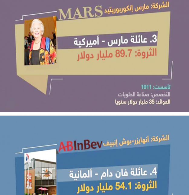 ويتضح من التصنيف المعتمد لدى بلومبرج أن عائلة والتون الأمريكية، التي تمتلك سلسلة محلات البيع بالتجزئة "وولمارت" هي الأكثر ثراءً في العالم بثروة تقدر بنحو 151.5 مليار دولار، تليها عائلة كوتش المختصة بمجال الصناعات بثروة تقدر بنحو 99 مليار دولار، ثم عائلة مارس الأمريكية صاحبة منتجات "مارس" و"ملكي واي" و"إم أند إم"، بثروة تقدر بنحو 90 مليار دولار.