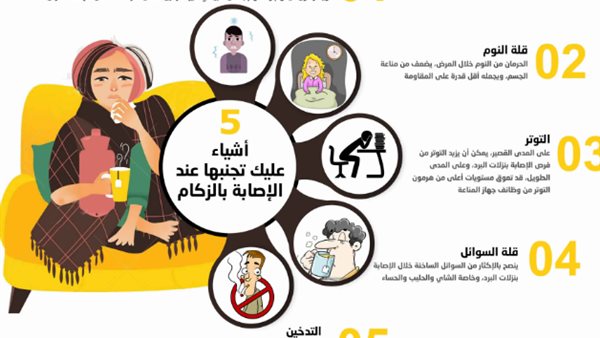 وفي الوقت الذي يُنصح بمراجعة الطبيب عند الإصابة بالزكام، هناك بعض الأشياء التي يُنصح بتجنبها، لأنها لا تساعد في تحسن حالة المريض، بل يمكن أن تزيدها سوءاً، بحسب موقع إن دي تي في الإلكتروني: