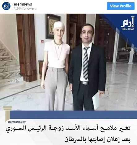 تداول نشطاء على مواقع التواصل الاجتماعي صورة جديدة لأسماء الأسد، زوجة الرئيس السوري بشار الأسد بعد نحو شهرين من إعلان إصابتها بسرطان الثدي.