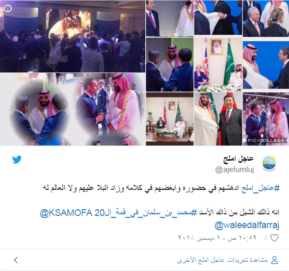 وكان مغردون أطلقوا عدة هاشتاغات تنقالوا من خلالها صور بن سلمان خلال القمة (#محمد_بن_سلمان_في_قمة_ال20 #محمد_بن_سلمان_في_قمة G20.