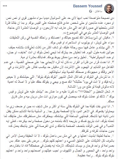 قدم الإعلامي الساخر باسم يوسف، عدة نصائح لمستخدمي وسائل التواصل الاجتماعي ومشاهير وسط السوشيال ميديا للتعامل مع المتابعين على صفحاتهم قائلا: "مفيش أي حاجة تستاهل إنك تضيع حياتك أو أعصابك وراحتك النفسية في ركن التعليقات على فيس بوك أو تويتر أو انستجرام".