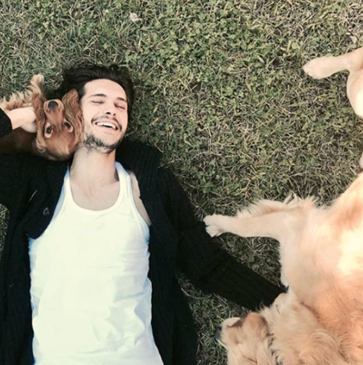 وعن الحادث يقول النجم: ”أثناء لعبي مع الكلب خلال جلسة تصوير، انقض على شفتي وجرحني جرحًا استلزم الخياطة“.