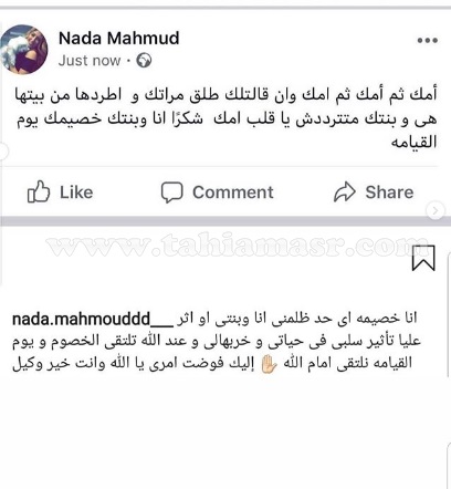 نشرت ندي محمد زوجة علي ربيع بوست غامض عبر صفحتها الرسمية علي موقع "فيسبوك" قالت فيه "أمك ثم أمك ثم أمك حتي لو قالتلك طلق مراتك واطردها من بيتها هي وبنتك.. ما تترددش.. شكرا أنا وبنتك خصيمك يوم القيامة، كما قامت بنشر ذات البوست علي حسابها علي موقع "انستجرام".