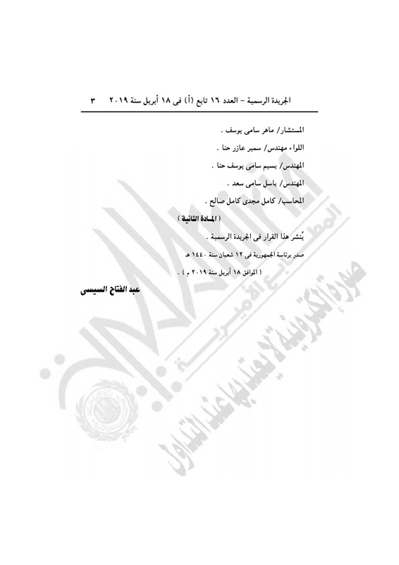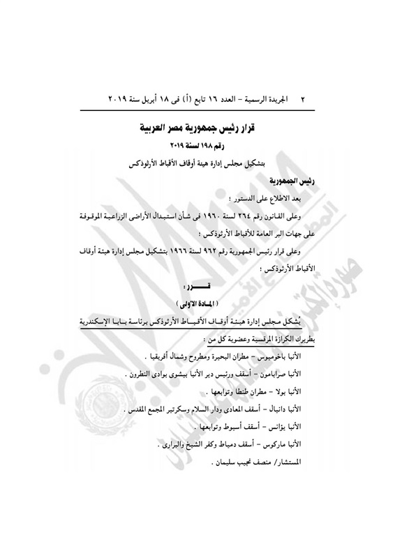 أصدر الرئيس عبد الفتاح السيسي، القرار رقم 198 لسنة 2019 بتشكيل مجلس إدارة هيئة أوقاف الأقباط الأرثوذكس.