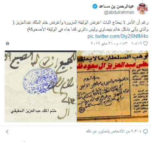واختتم ردّه على مقدم البرامج في قناة ”الجزيرة“ جمال ريان بالقول ”رغم أن الأمر لا يحتاج إثبات اعرض الوثيقة المزورة وأعرض ختم الملك عبدالعزيز ( والذي يأتي بشكل خاتم بيضاوي وليس دائري كما جاء في الوثيقة الأضحوكة)“.