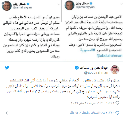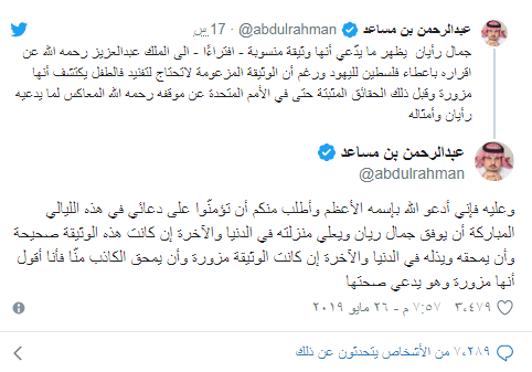 رد الأمير السعودي عبدالرحمن بن مساعد بن عبدالعزيز آل سعود، على الإعلامي الفلسطيني جمال ريان الذي نشر وثيقة تدعي تنازل الملك الراحل عبدالعزيز بن عبدالرحمن آل سعود أرض فلسطين لصالح اليهود.