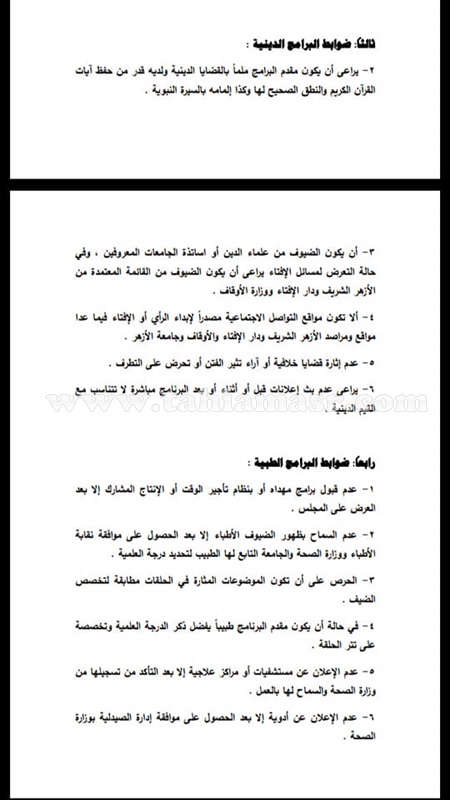 نشر المجلس الأعلى للإعلام عدة ضوابط خاصة بتنظيم برامج التوك شو والبرامج الدينية وأيضا البرامج الطبية التي يتم إذاعتها على القنوات الفضائية.