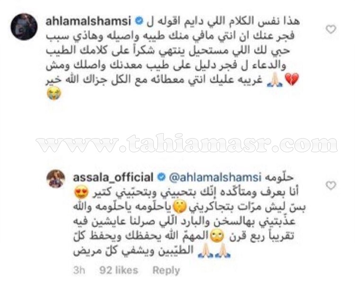 ومن جانبها ردت أصالة على أحلام قائلة: "حلومة أنا بعرف ومتأكدة إنك بتحبيني وبتحبيني كتير.. بس ليش مرات بتجاكريني يا حلومة يا حلومة والله عذبتيني بهالسخن والبارد اللي صارلنا عايشين فيه تقريبا ربع قرن.. المهم الله يحفظك ويحفظ كل الطيبين ويشفي كل مريض".
