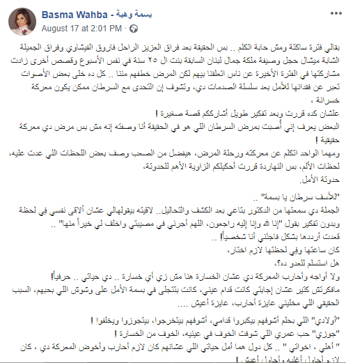 وكتبت الإعلامية منشور عبر صفحتها الرسمية علي موقع التواصل الاجتماعي "فيسبوك"، قالت فيه: "بقالي فترة ساكتة ومش حابة اتكلم بس الحقيقة بعد فراق العزيز الراحل فاروق الفيشاوي وفراق الجميلة الشابة ميشال حجل وصيفة ملكة جمال لبنان السابقة بنت ال ٢٥ سنة في نفس الأسبوع وقصص أخرى زادت مشاركتها في الفترة الأخيرة عن ناس اتعلقنا بيهم لكن المرض خطفهم مننا.. كل ده خلى بعض الأصوات تعبر عن فقدانها للأمل بعد سلسلة الصدمات دي، وتشوف إن التحدى مع السرطان ممكن يكون معركة خسرانة.. علشان كده قررت وبعد تفكير طويل أشارككم قصة صغيرة، البعض يعرف إني أُصبت بمرض السرطان اللي هو في الحقيقة أنا وصفته إنه مش بس مرض دي معركة حقيقية".