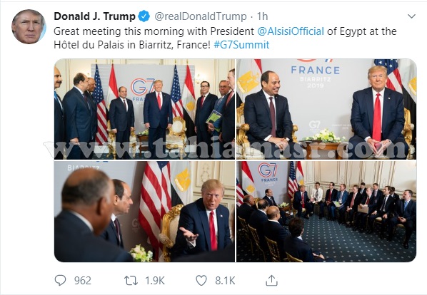 غرد الرئيس الأمريكى، دونالد ترامب، على حسابه بموقع تويتر مشيدًا باللقاء الثنائى الذى جمعه مع الرئيس عبد الفتاح السيسي، خلال قمة مجموعة السبع المنعقدة حاليا فى مدينة بياريتز فى فرنسا.
