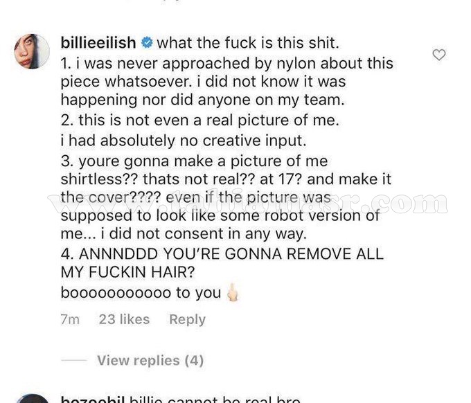 اعربت مغنية البوب الشهيرة بيلي ايليش، عن غضبها بعد نشر مجلة NYLON، صورة غير حقيقية لها بلا قميص، وجعلتها غلاف لها بدون أن تطلب إذنها.