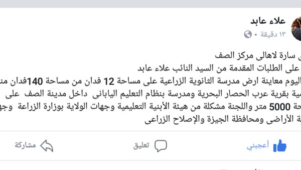 أعلن علاء عابد، رئيس لجنة حقوق الإنسان بمجلس النواب، عضو البرلمان عن مركز الصف، أن اليوم معاينة أرض مدرسة الثانوية الزراعية على مساحة 12 فدان من مساحة 140فدان منافع عمومية بقرية عرب الحصار البحرية ومدرسة بنظام التعليم الياباني داخل مدينة الصف على مساحة 5000 متر.
