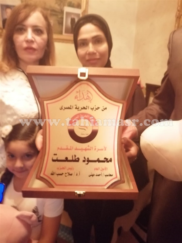 وقام وفد من حزب الحرية المصري، تحت رعاية الدكتور صلاح حسب الله، رئيس الحزب، والمحاسب احمد مهنى الامين العام، بزيارة اسرة الشهيد المقدم محمود طلعت، يأتي هذا تزامناً مع ذكرى انتصارات حرب اكتوبر المجيدة، وفي اطار دعم الحزب لبطولات الجيش المصري وتضحياته على مر العصور حيث ان شهداء الجيش هم ابطال الحرب على الارهاب.