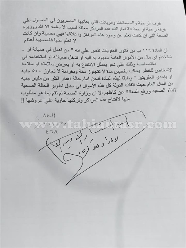 واكد النائب محمود بدر، انه تم تجهيز المراكز على اعلى مستوى، وهناك نموذج موجود على الارض فى محافظة الجيزة تم تجهيزه بعدد ٤ اسرة اقامة و٢ اسرة رعاية و٤ حضانات اطفال " اللي بنعاني اصلا في موضوع حضانات الاطفال ده" و٢ جهاز سونار و١ اشعة سينية، وغرفة عمليات ومعمل متكامل و٣ عيادات خارجي، الا ان المفاجأة انه بعد انتهاء الوزارة من تجهيز هذه المراكز في ٢٠١٧ تم اغلاقها ولم يتم فتحها للعمل حتي الآن دون ابداء اي سبب.