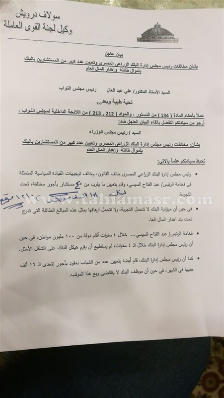 تقدمت النائبة سولاف درويش وكيلة لجنة القوى العاملة بمجلس النواب بييان عاجل الى الدكتور على عبد العال رئيس المجلس، بشان تعيين 45 مستشار للبنك الزراعى.