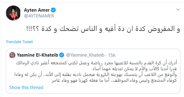 وعلقت الإعلامية ياسمين الخطيب عن انتقال اللاعب محمود عبد المنعم كهربا إلى النادى الأهلى، وانتقدت ياسمين، اللاعب محمود كهربا لتصرفه، ولكن هذا الانتقاد أثار استياء الفنانة آيتن عامر.وقالت فى تغريدة: "أدرك أن كرة القدم بالنسبة للاعبيها مجرد رياضة وعمل لكنى كمشجعه اعتبر نادى الزمالك قدرا أبديا كالأب والأم لا يمكن تبديله مهما أساء.. وأتوقع من اللاعب أن يتمسك بهويته الكروية فيحمل ناديه بقلبه إلى الأبد.. أن يكن له وفاءا كوفاء المشجع وليس وفاء الموظف.. أما ما فعله كهربا فهو وفاء عامر".