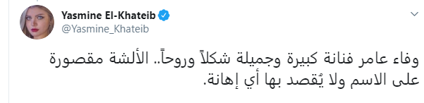 وحاولت ياسمين الخطيب تبرير موقفها لتقول: وفاء عامر فنانة كبيرة وجميلة شكلًا وروحًا.. الالشة مقصورة على الاسم ولا يُقصد بها أي إهانة.