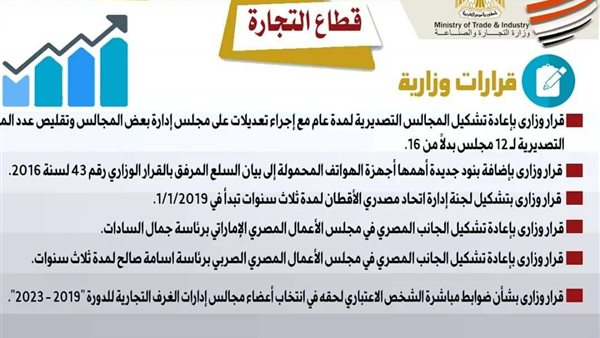 تحيا مصر تنشر حصاد القرارات الوزارية للصناعة في ٢٠١٩ الأحد 29/ديسمبر/2019 - 04:34 م 12/29/2019 4:34:15 PM اقتصاد وبنوك إيمان الحمصاني طباعة قامت وزارة الصناعة والتجارة بإصدار عدد من القرارات الوزارية خلال عام ٢٠١٩ ، وتستعرض تحيا مصر هذه القرارات من خلال السطور التالية facebook twitter whats شارك تابع موقع تحيا مصر علي جوجل نيوز تطبيق نبض