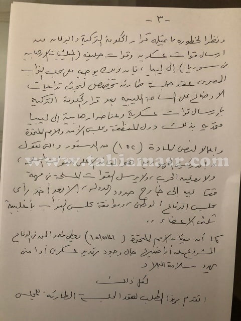 وشن هجوما ضد ما تقوم به حكومة السراج في مخالفة اتفاق الصخيرات، حول توقيع أي اتفاقية يكون بالتنسيق بين البرلمان الليبي وحكومة الوفاق والقوات المسلحة، إلا أن الحكومة الليبية حرقت الاتفاق وقامت بتوقيع اتفاق مع تركيا لإرسال قوات تركية للأراضي الليبية.