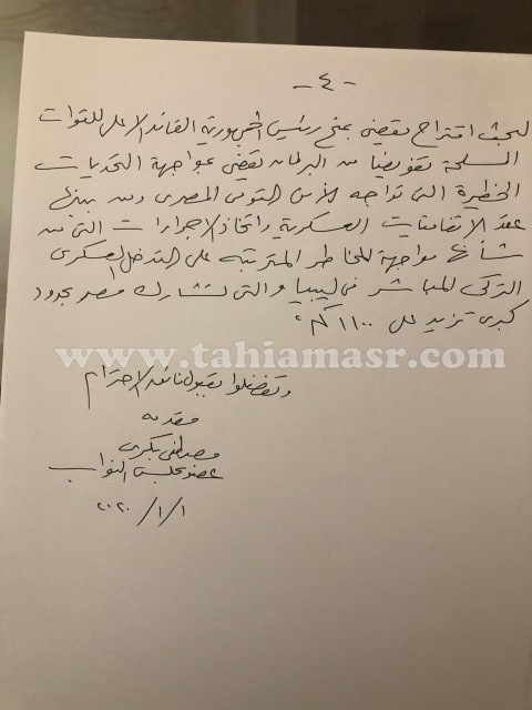 وأوضح أن الغرض من الجلسة الطارئة، تفويض رئيس الجمهورية بصفته القائد الأعلى للقوات المسلحة، لاتخاذ ما يلزم في شأن حماية الأمن القومي المصري، إيزاء ما يحدث من تدخلات تركية على الأراضي الليبية.
