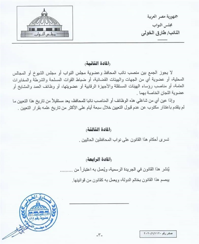 وتنص (المادة الثانية"لا يجوز الجمع بين منصب نائب المحافظ وعضوية مجلس النواب أو مجلس الشيوخ أو المجالس المحلية، أو عضوية أي من الجهات والهيئات القضائية، أو ضباط القوات المسلحة والشرطة والمخابرات العامة، أو مناصب رؤساء الهيئات المستقلة والأجهزة الرقابية أو عضويتها، أو وظائف العمد والمشايخ أو عضوية اللجان الخاصة بهما، وإذا عين أي من شاغلي هذه الوظائف أو المناصب نائبا للمحافظ، يعد مستقيلاً من تاريخ هذا التعيين ما لم يتقدم باعتذار مكتوب عن عدم قبول التعيين خلال سبعة أيام على الأكثر من تاريخ علمه بقرار التعيين.