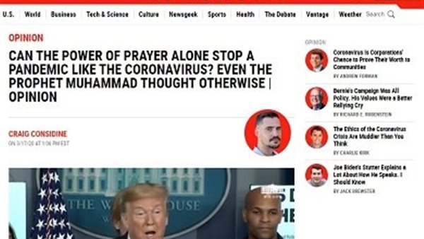 وتحت عنوان: "هل يمكن لقوة الصلاة وحدها وقف جائحة؟ حتى النبي محمد كان له رأي آخر"، قال الباحث كريج كونسيدين، في مقاله المنشور إن خبراء المناعة مثل الطبيب انتوني فوتسي والمراسلون الطبيون مثل سانجي جوبتا يقولون إن نظافة شخصية جيدة وحجر صحي هي أفضل الوسائل لتطويق كوفيد-19.